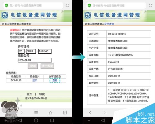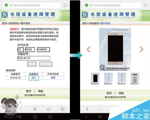 在查询结果页面,点击【显示】查看手机在申请办理进网许可证时提交外观照片,或者点击【查看】查看进网许可证信息。