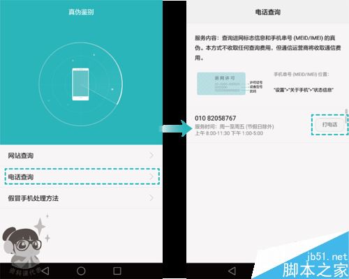 以“手机服务”为例:点击【手机服务】>【真伪鉴别】>【电话查询】,点击【打电话】呼叫。然后,按照语音提示进行操作。
