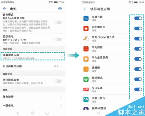点击【手机管家】>【剩余xx%】(电池管理)>【锁屏清理应用】,根据自己需求,选择锁屏后系统将自动清理的应用。不仅有省电作用,还能有效提高手机运行的流畅度。但注意,邮件、聊天等社交类应用类被清理后,可能无法及时接收到新消息哦。