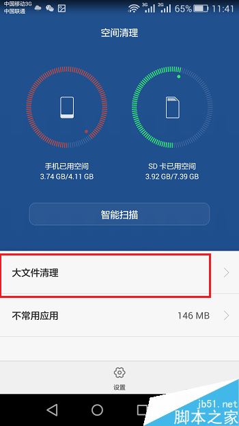 第三步进去空间清理之后,我们就可以看到“大文件清理”了,点击进去,如下图所示: