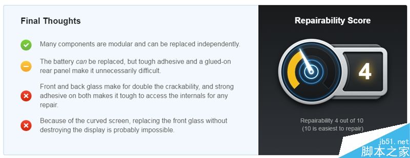iFixit给Galaxy S8+最终的评分同样是4分,主要是双面玻璃易碎,而且影响拆解,导致最终成绩偏低。