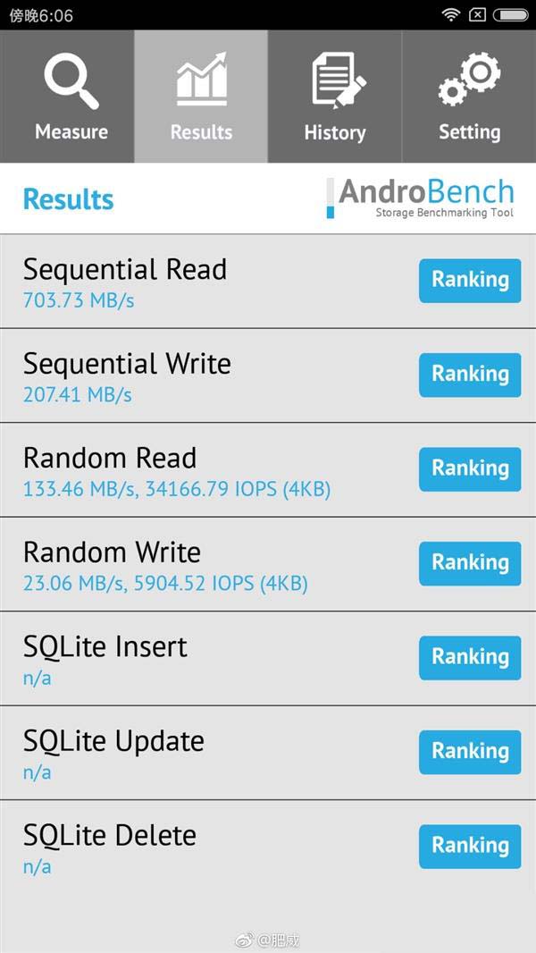 从图中可以看到,小米6的AndroBench跑分成绩中,持续读取速度在700MB/S以上,持续写入速度在200MB/S以上,符合UFS2.1标准。不过这个成绩针对的是128GB的小米6尊享版,小米6标准版和高配版的成绩尚未出炉。
