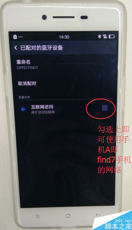 (2)OPPO手机A进入蓝牙,与手机B配对连接,连接成功后,手机B进入蓝牙,点击已配对设备右侧的功能按钮,勾选“互联网访问”。(手机A需要开启网络开关,手机B不要开启蓝牙共享网络)。