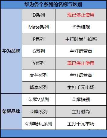 目前华为与荣耀旗下拥有10个子系列,加上相似的名字,让人很容易混淆,为了帮助读者理清各个系列,笔者做了一张表格,具体如下: