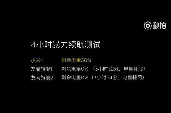 在小米6的发布会上,对于小米6的续航能力,小米官方也给出了一组测试数据:小米在将手机充满电的情况下,对手机进行了连续四小时的暴力续航测试,其中包括一小时在线视频、一小时NBA2K游戏、一小时在线音乐、半小时视频录制以及半小时的微信视频。