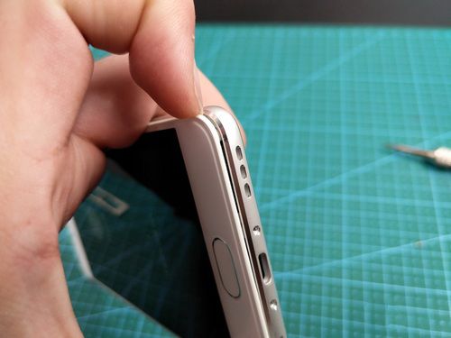 我们使用屏幕开启器,给手机的底部翘起一个小口,用翘片一点一点翘起手机(这里的卡扣比较紧,需要稍微用些力气),由于手机后盖和手机内部没有排线链接,均为触点链接,所以可以直接拿下来。