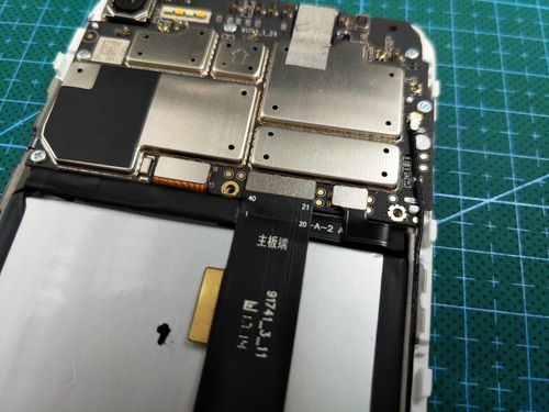 首先对手机进行断电,,先找到电池的BTB,电池BTB在主板底部的金属固定片下方,所以需要拧下来这两颗螺丝,接下来就可以用塑料撬将其断电,之后我们就可以继续拆解了。