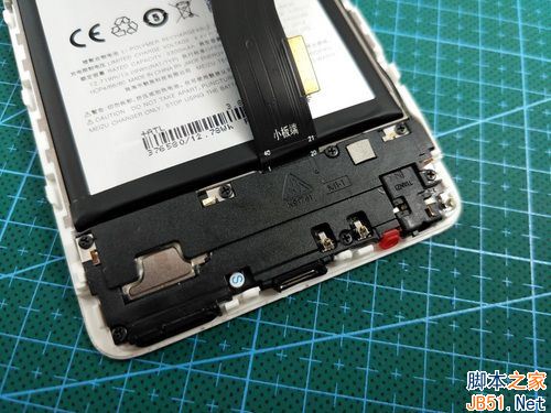 拿开后盖后,我们就可以直接看到手机的内部构造了。手机内部采用三段式的结构,上方为主板,中间为电池区,底部为副板。
