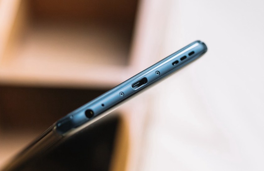 图为魅蓝E2机身底部特写,底部配备Micro USB接口和耳机接口。