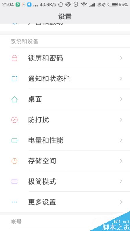 点击图标后,就打开了设置选项,向上拖动项目,找到“设备和系统”中的“锁屏和密码”选项