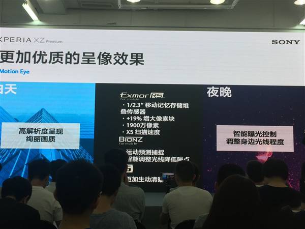 XZ Premium最大的亮点是拍照部分。后置摄像头1900万像素,内置IMX400传感器(首款搭载DRAM的三层堆叠式CMOS)。配备Motion Eye系统,支持960fps(720p分辨率)慢镜头视频拍摄,0.03秒混合对焦。