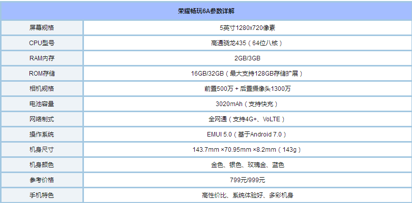 在进行测试之前,我们先来看下荣耀畅玩6A参数配置,如下表格所示。