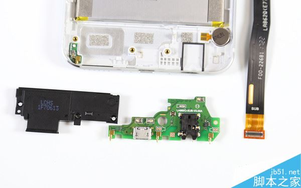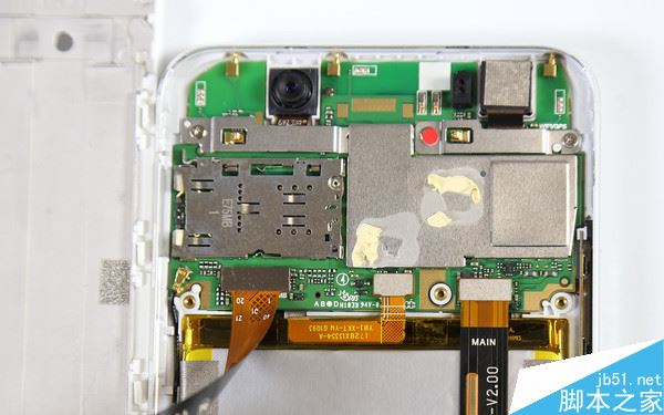 将屏幕与机身分离后,我们发现海信H10的绝大多数元器件都在后盖一侧,屏幕这边则没有什么元器件。屏幕与主板通过排线相连,连接处有金属片固定。