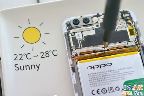 其内部结构紧凑有序,在如此轻薄的机身下还塞入了3000mAh的电池。而且更重要的是,OPPO还对机身做了防水设计,有了这项功能,即便是日常使用中不小心溅到了水也不必担心它会损坏,以上这些都是OPPO工业设计的有力证明。