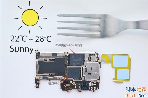 OPPO R11的主板布局确实考究,背面主要是核心元件,骁龙660处理器、三星的内存、闪存等等,其中内存和闪存采用eMCP封装在了一起,可以减小机身厚度。
