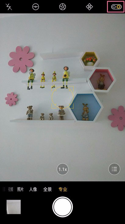 2、点击“专业模式”,右上角的标识就代表2个摄像头。