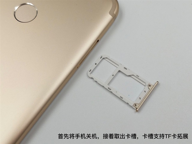 一、首先将小米5X手机关机,然后取出卡针,将机身侧面的SIM卡托取下,如图所示。