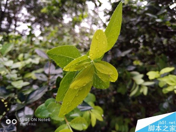 拍摄近景图片时,魅蓝Note6 f/1.9的大光圈发挥了实力。从这张雨后叶子的图片可以看出,叶子上面的水珠依然清晰可见,而背景的虚化效果显得非常自然。魅蓝Note6选择的这颗1200万像素的相机CMOS,确实可以排在第一梯队。