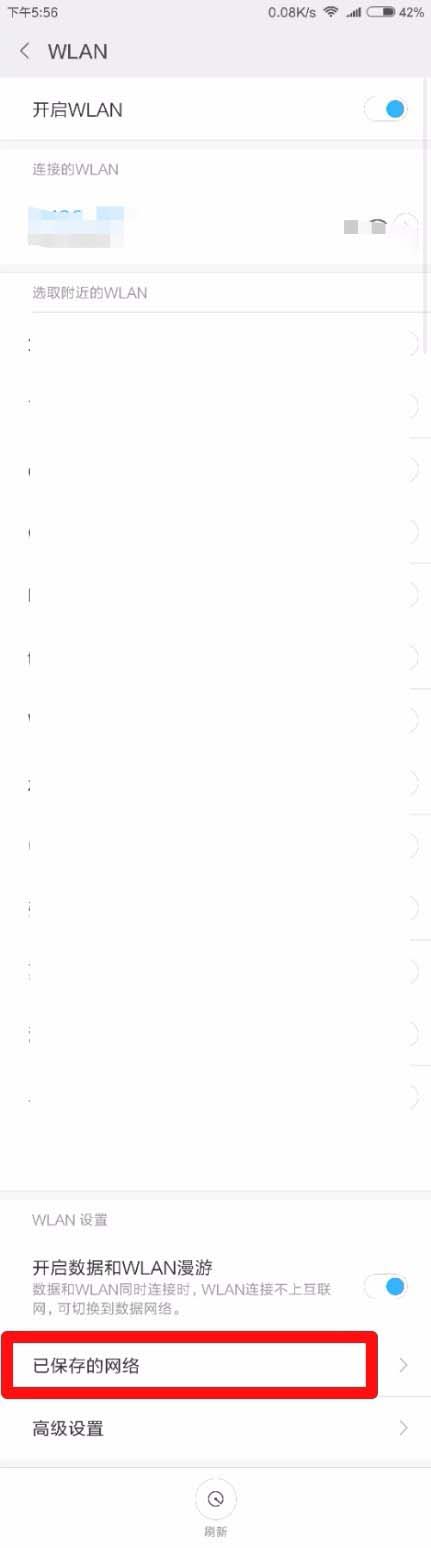 3、在wifi连接界面下划,找到已保存的网络一栏,点击进入。