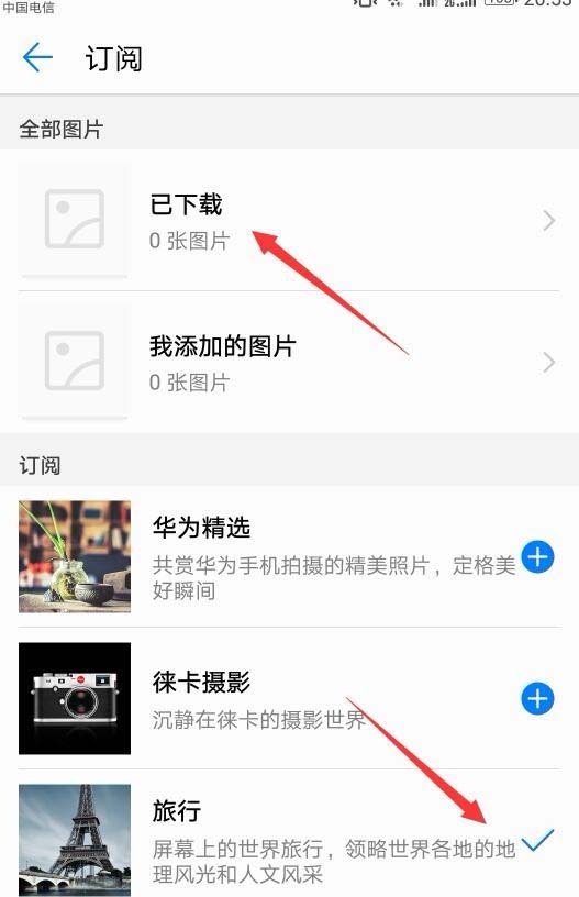 5、先在下方选择一个锁屏壁纸的图片类别,比如我选择了“旅行”,然后点击“已下载”