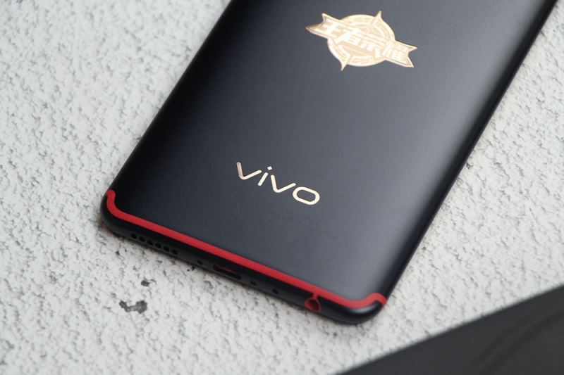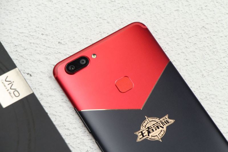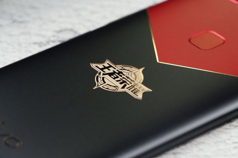 vivo X20王者荣耀周年庆限量版采用了红黑撞色的设计,机身从中间为界,用一条V型金色腰线分割开来,并印有王者荣耀的“王者之印”定制徽章。
