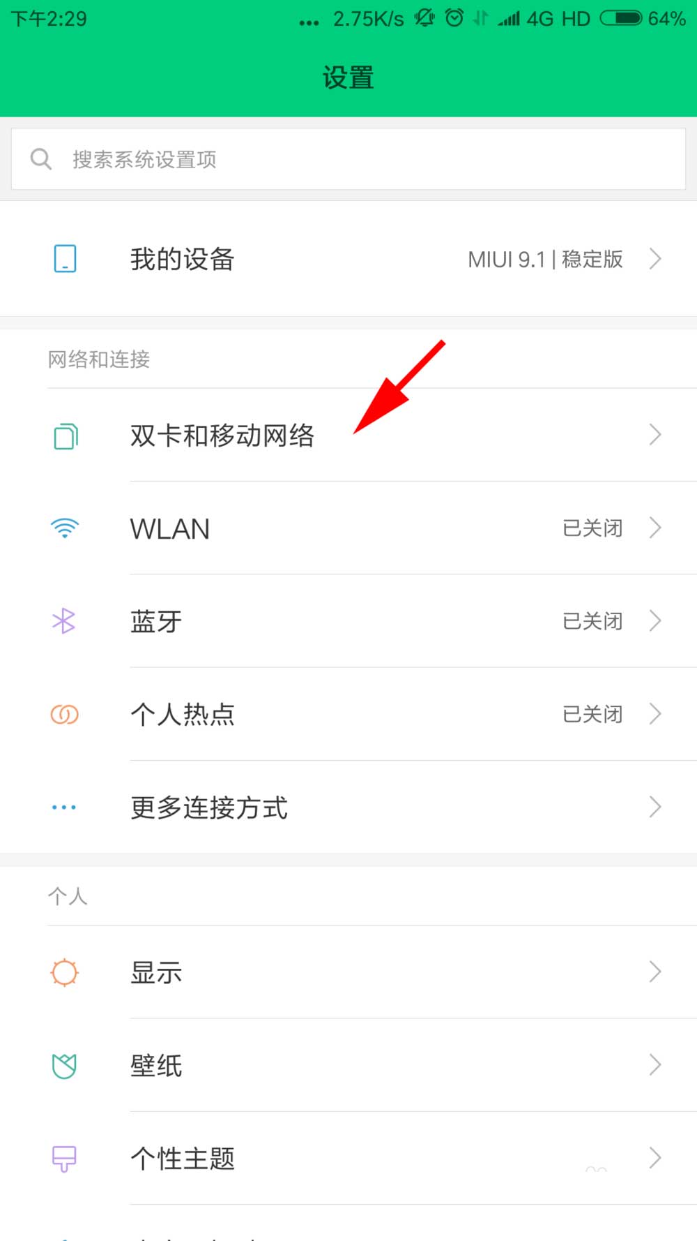 2、进入到设置界面,点击双卡和移动网络