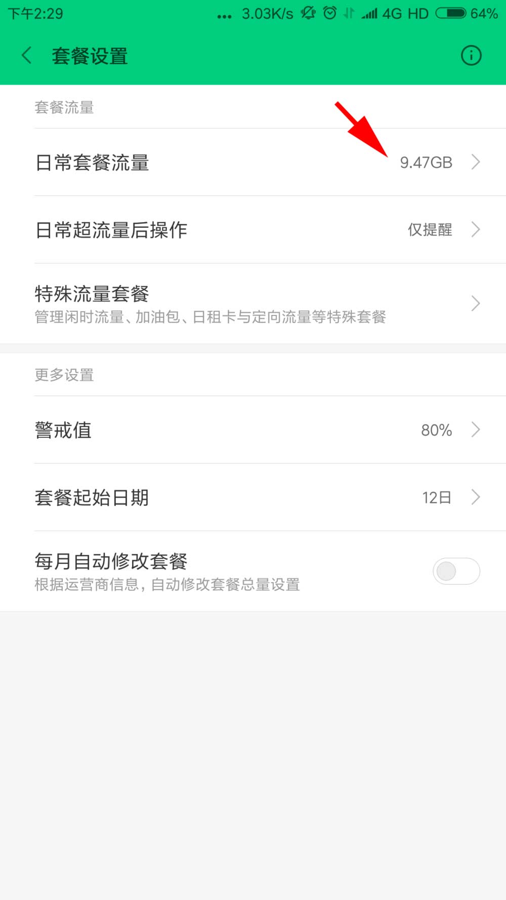 5、设置日常套餐流量,这里输入手机卡实际套餐的值