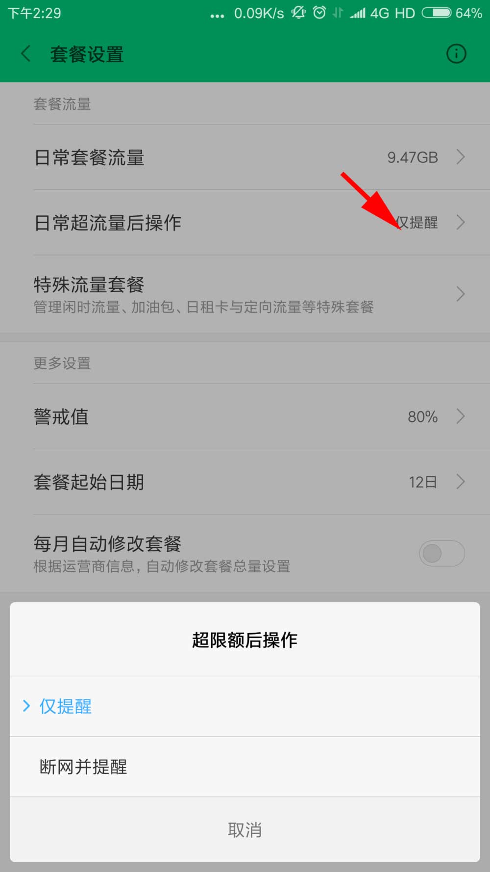 6、设置日常超流量后操作,可以选择提醒或者断网并提醒