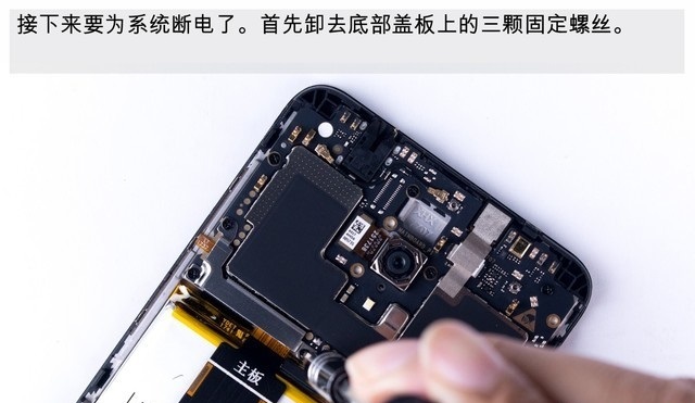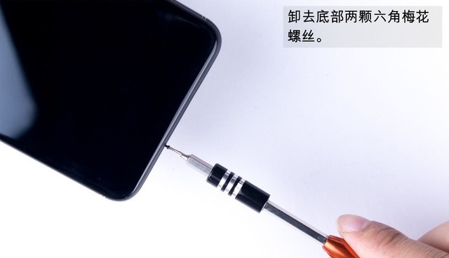 二、作为一款金属机身设计,360N6后盖同样是采用常见的螺丝+卡扣固定设计,因此首先需要使用六角螺丝刀,将底部的两颗后盖固定螺丝拆卸下来,如下图所示。