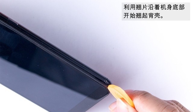 三、接下来使用塑料薄片沿着机身底部开始翘起后壳,如下图所示。
