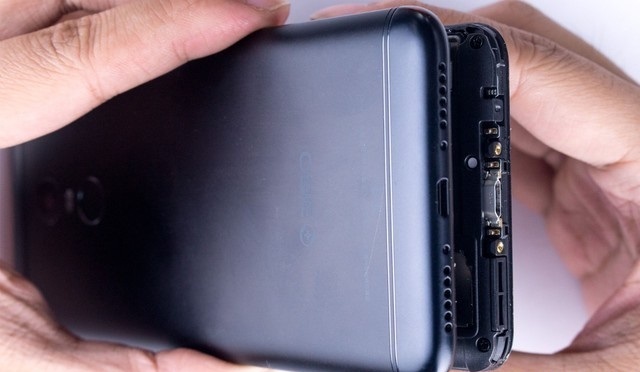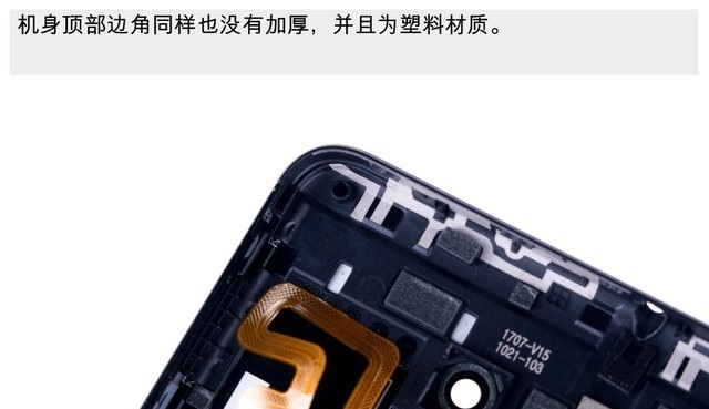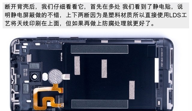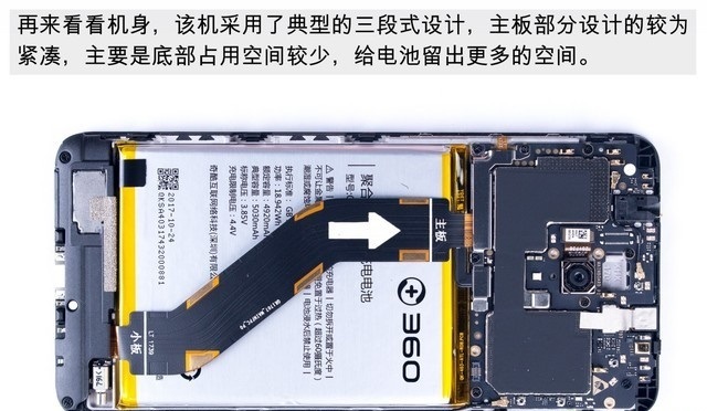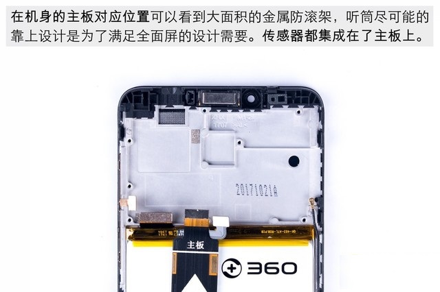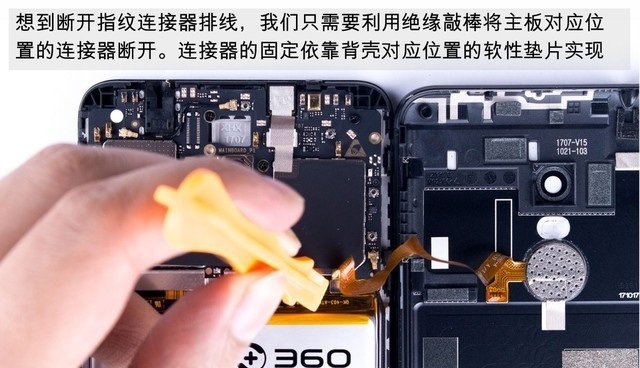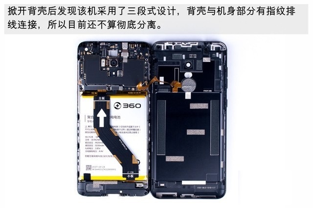 四、掀开后壳后可以发现,360手机N6内部采用了常见的三段式设计,由于后壳与机身部分还有指纹排线连接,所以目前分离还不算彻底。