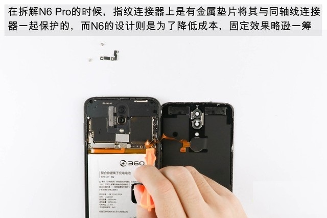 在拆机N6 Pro的时候,指纹连接器上是有金属垫片将其与同轴线连接器一起保护的,而N6的设计则是为了降低成本,固定效果略逊一筹。