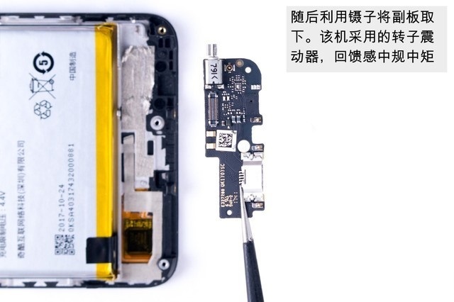 随后就可以将底部小板以及扬声器、震动模块等小配件一并拆下来了,如下图所示。
