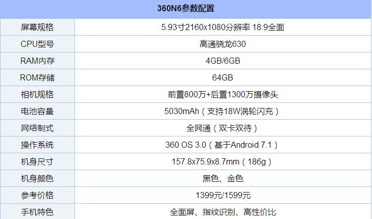360N6延续了360手机一贯的高性能特性,有时下流行的全面屏、经典神U骁龙625升级版骁龙630八核处理器、内置5030mAh超大容量快充电池等,对于千元机来说,硬件上表现突出,稍显遗憾的地方在于没有配备时下流行的双摄像头。