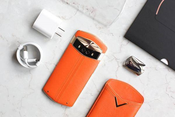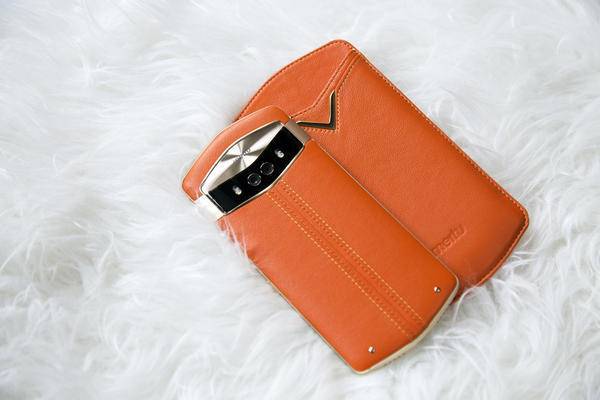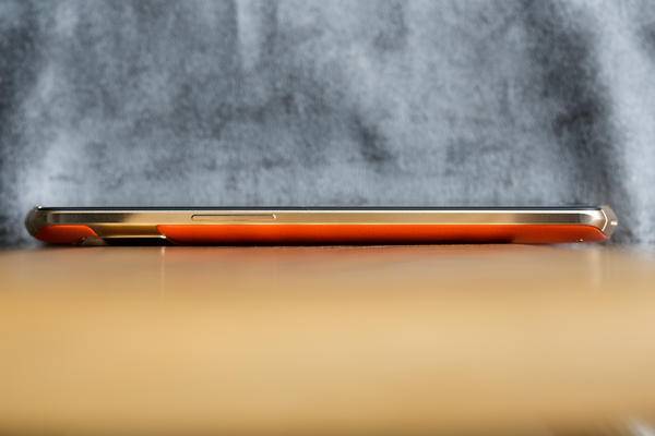 美图 V6 机身背面选用欧洲荷兰的限量头层小牛皮,图中这款的配色为 鹿特丹橙,另外还有 爱丁堡蓝、 墨尔本绿、 摩洛哥粉配色。除了采用来自荷兰的限量头层小牛皮,V6 机身背部的底部还镶制了两颗 18K 真金的铆钉,机身中部为撞色手工缝线,种种细节使得美图 V6 的手机质感提升了不少。