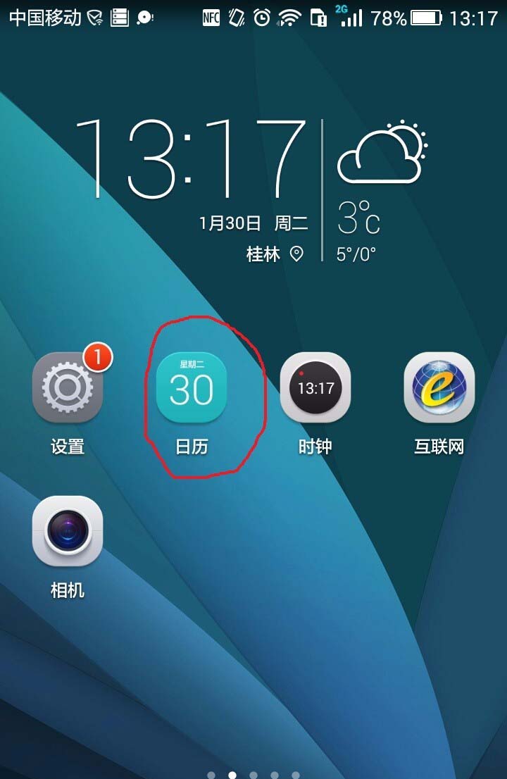 如今年是高中毕业20年了。同学们发起聚会活动,决定在2018年7月20日在桂林桂山大酒店举行聚会活动10点钟开始。需要按时参加活动,考虑路程问题,我计划9点钟出发,8点钟设置手机提醒。今天是2018年1月30日,设置过程如下:滑动手机桌面,找到有“日历”图标的页面。如图下图示。