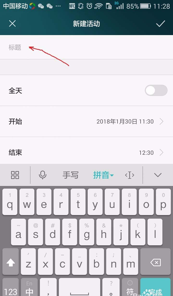 3、点击上图中下边的“新建”字体,进入到如下图所示的“新建活动”页面。提示输入标题。在图中输入标题:20年高中同学聚会10点开始。再点击“开始”栏设置提醒开始时间,点击后进入下一步的页面。