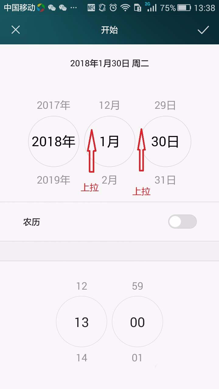 6、按图中右上角的箭头方向点击“√”,这样就完成开始日期时间设定。进入下一页面。