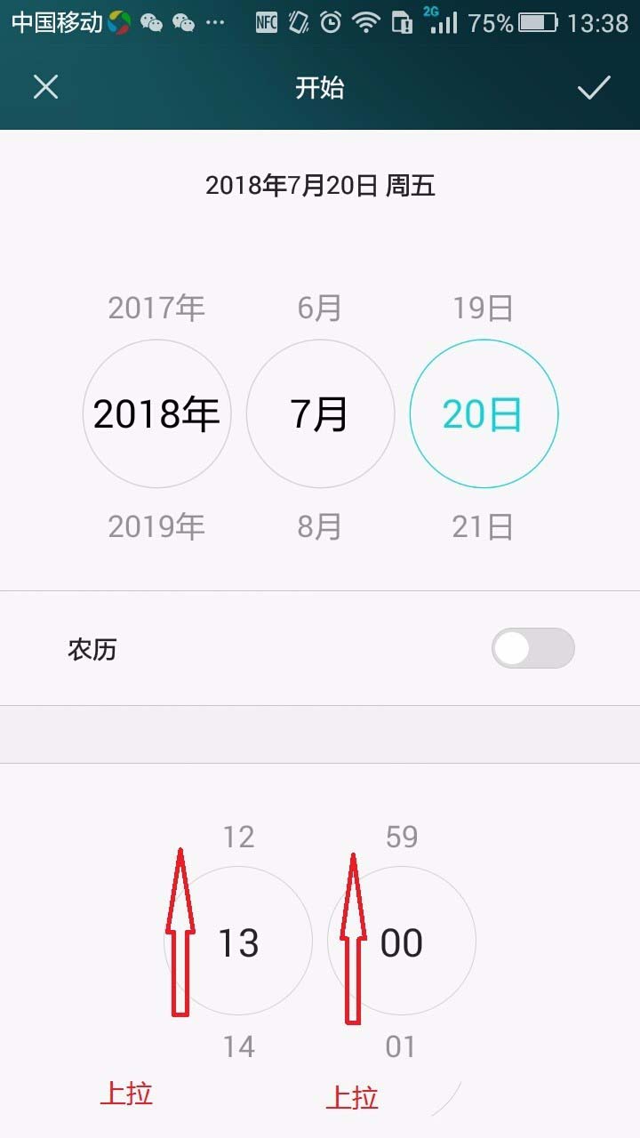 4、在如下图的页面中按箭头方向上拉将当前日期调整为预定提醒日期:2018年7月20日。如下一步图中所示。