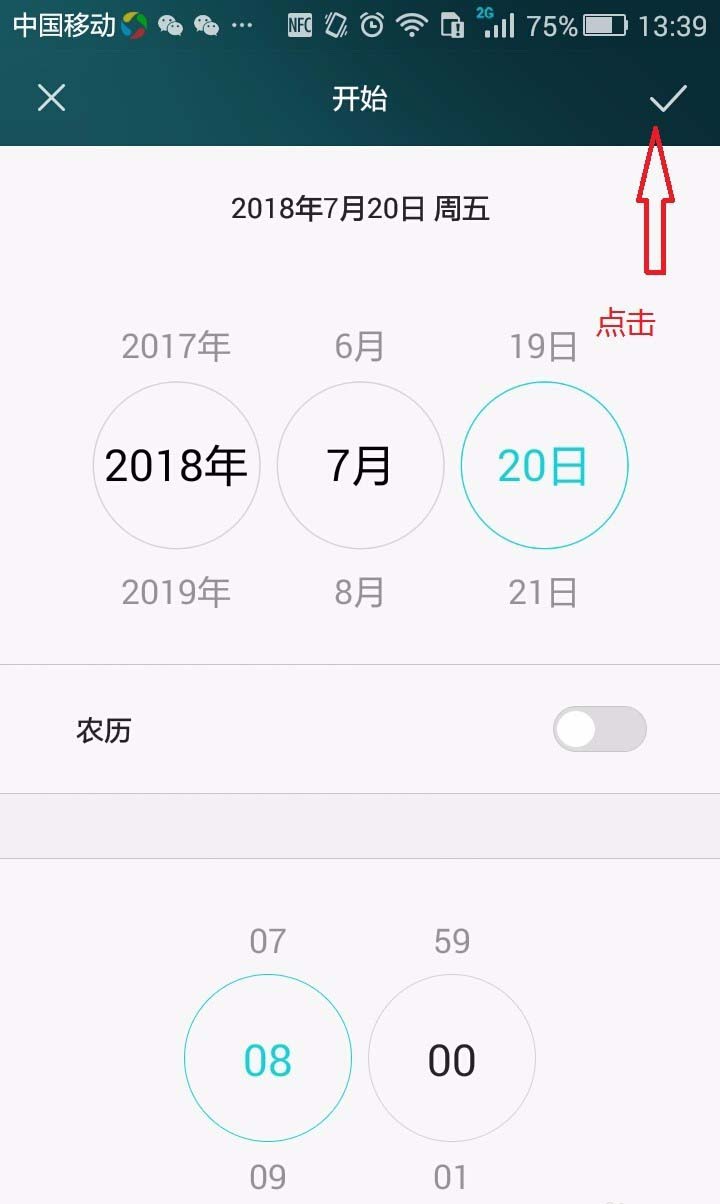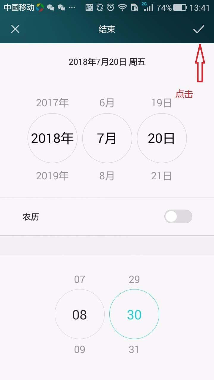 8、在“结束”日期时间设置界面中,将当前日期时间调整结束日期时间为:2018年7月20日 8点30分钟。如下图所示。再按图中箭头方向点击右上角的“√”,这样就完成了结束时间的设定。