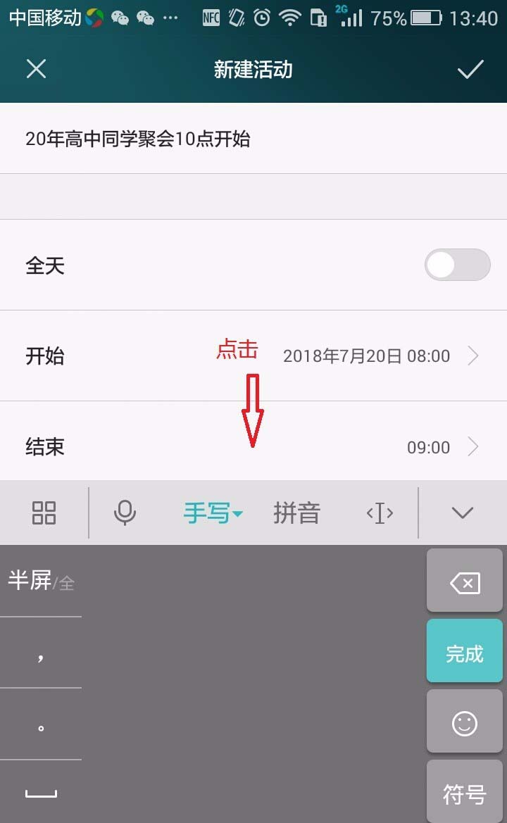 1、首先我们明确日程安排的日期时间:就以参加同学聚会为例进行备忘录设置。
