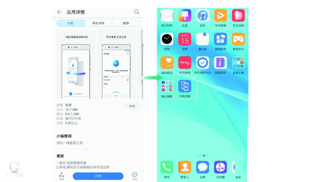 本次演示使用的为华为应用市场,手机克隆版本为8.0.1.300,实际操作界面请以实际版本为准