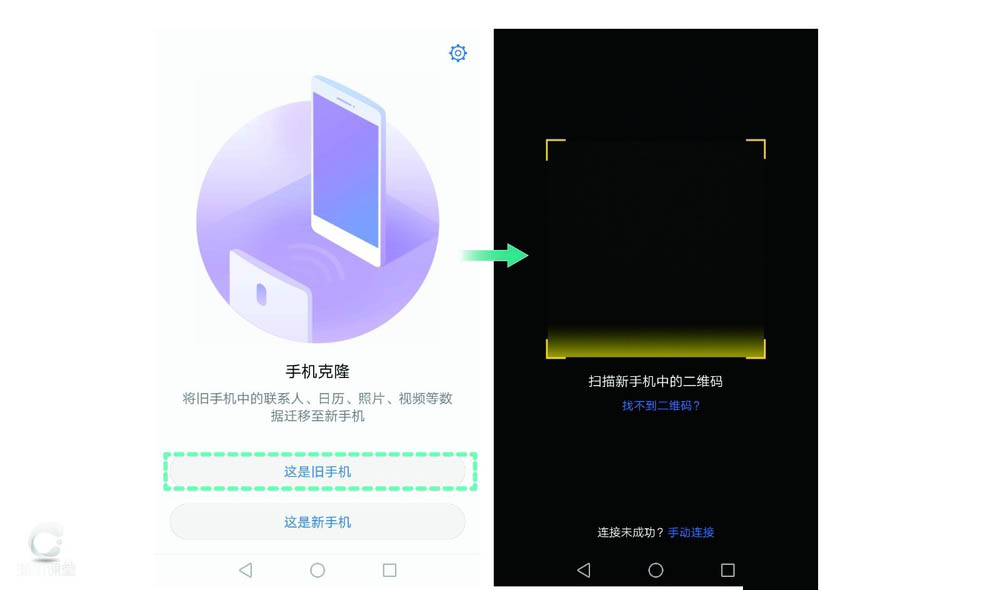 在新手机上启动手机克隆,选择这是新手机,选择旧手机类型后点击接收。新手机会建立一个热点。此时使用旧手机扫描新手机中的热点二维码或手动进行连接。新旧手机连接完成后新手机会提示已连接旧手机。