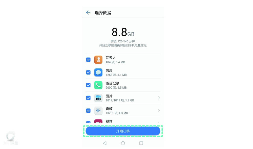 在旧手机上选择要搬家的数据项,点击开始迁移。就这么简单!