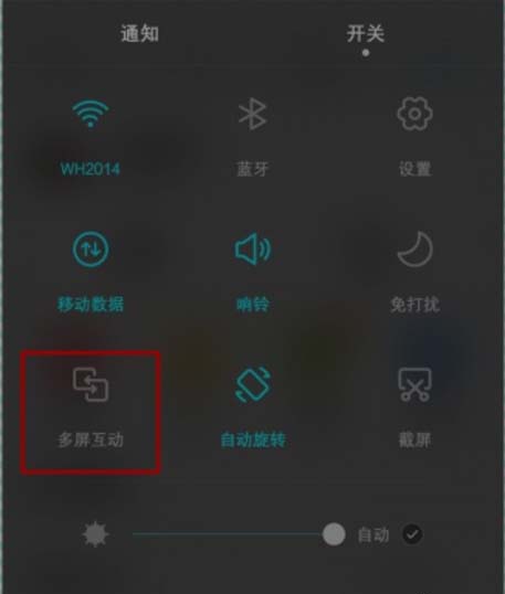 3、从手机顶部下拉通知栏,选择通知栏图二的多屏互动功能打开。要保持盒子跟手机同一wifi下。