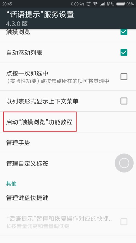 8、进入语音阅读屏幕的功能设置页面之后,点击设置页面中的“启动触摸浏览功能教程”选项。