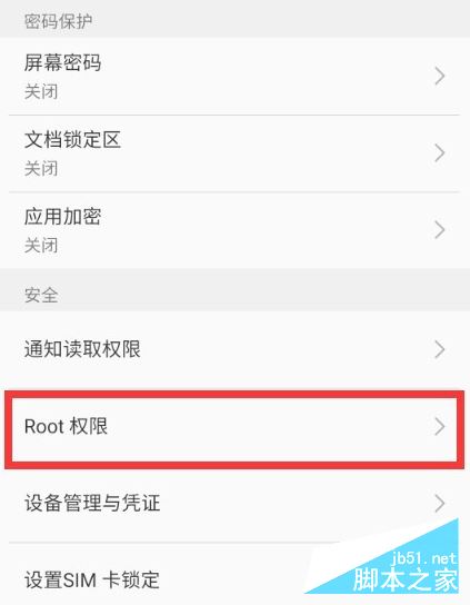 2.从打开的“安全”界面中,就可以看到“ROOT权限”项,如图所示,点击即可进入ROOT权限管理界面。