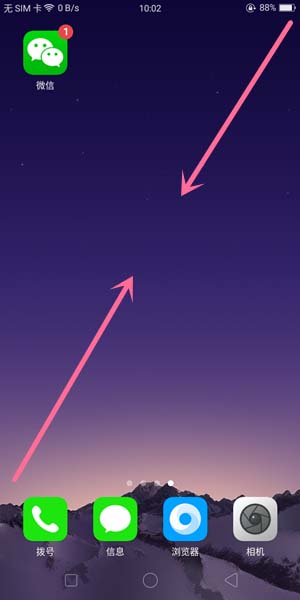 1、先打开手机进入桌面,找到有空白地方的页面,双指在屏幕对角的地方向内缩进。