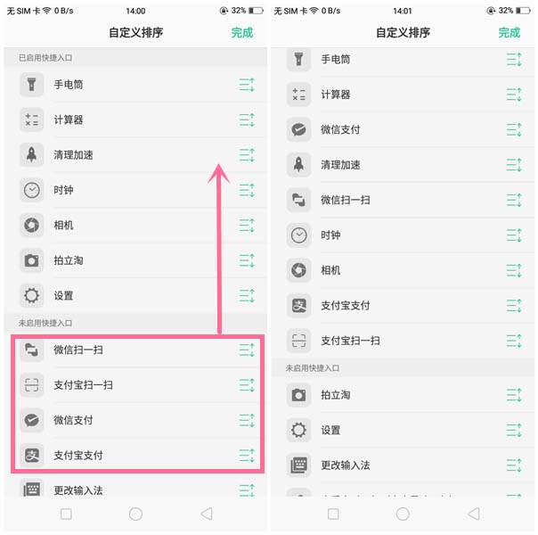 4、然后将【微信支付】、【支付宝支付】、【微信扫一扫】、【支付宝扫一扫】的快捷入口向上移动,放进“已启用快捷入口”中。