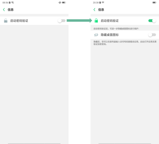 选择需要加密的应用 -- 启动密码验证 -- 开启【隐藏桌面图标】